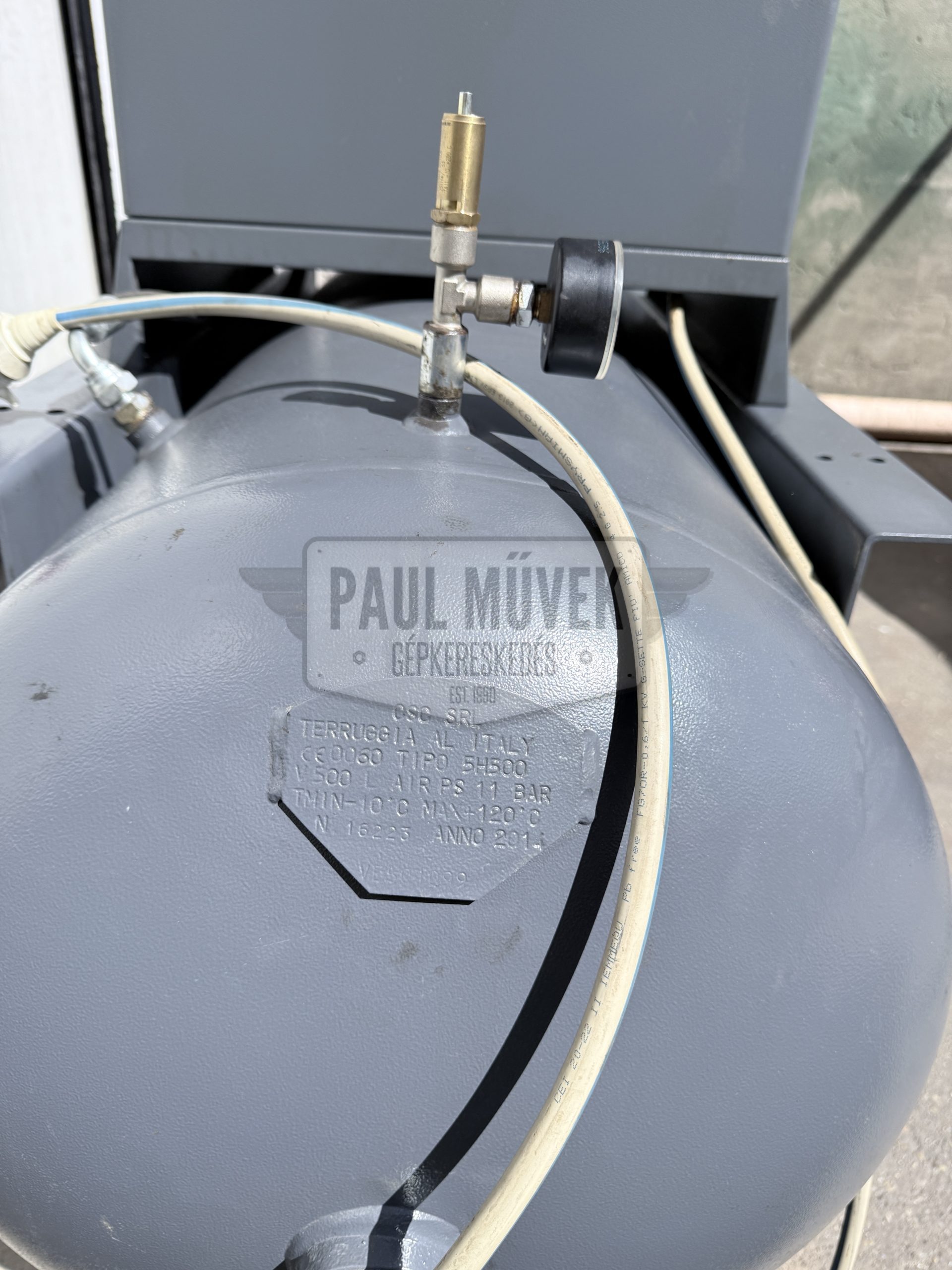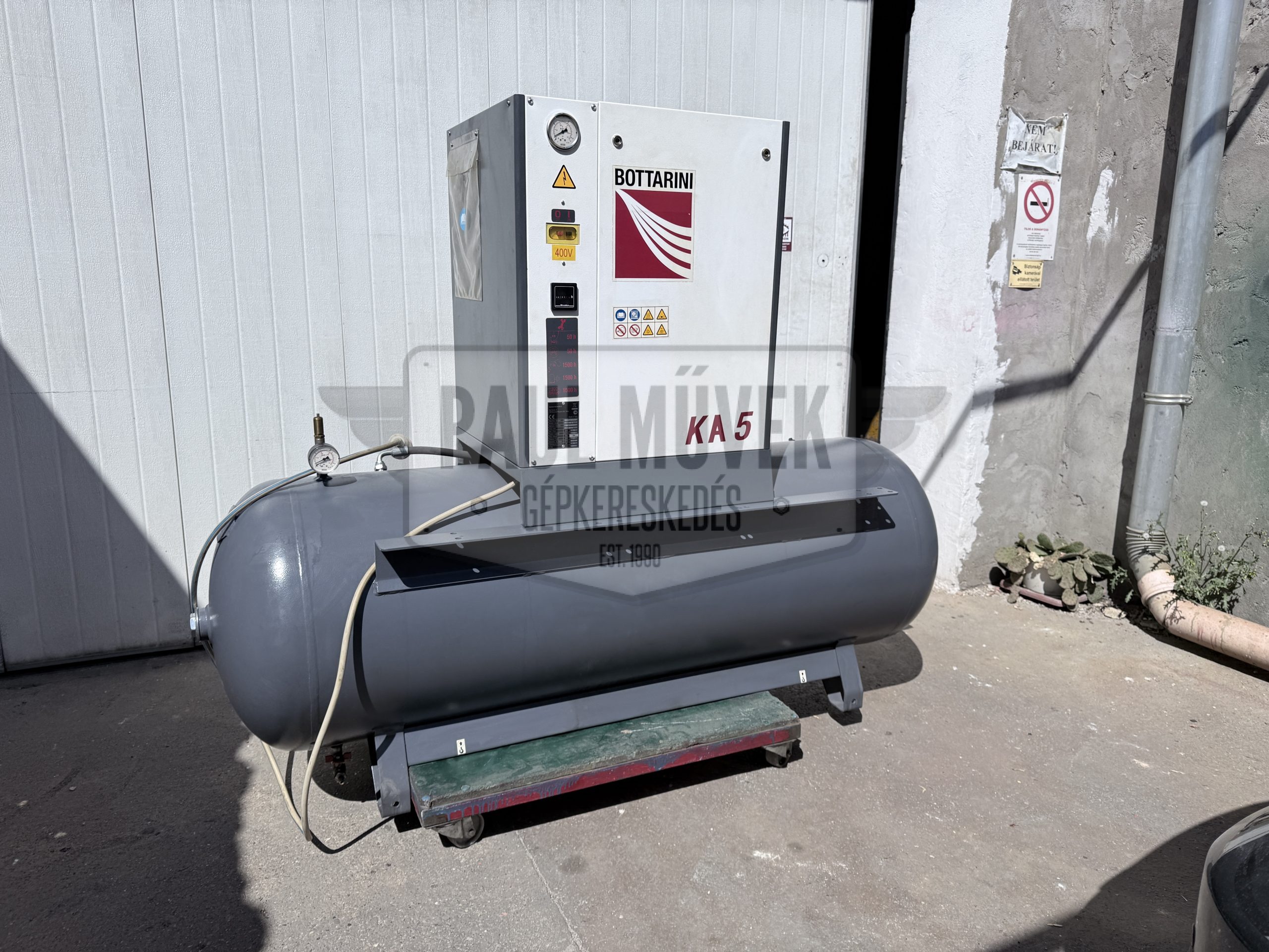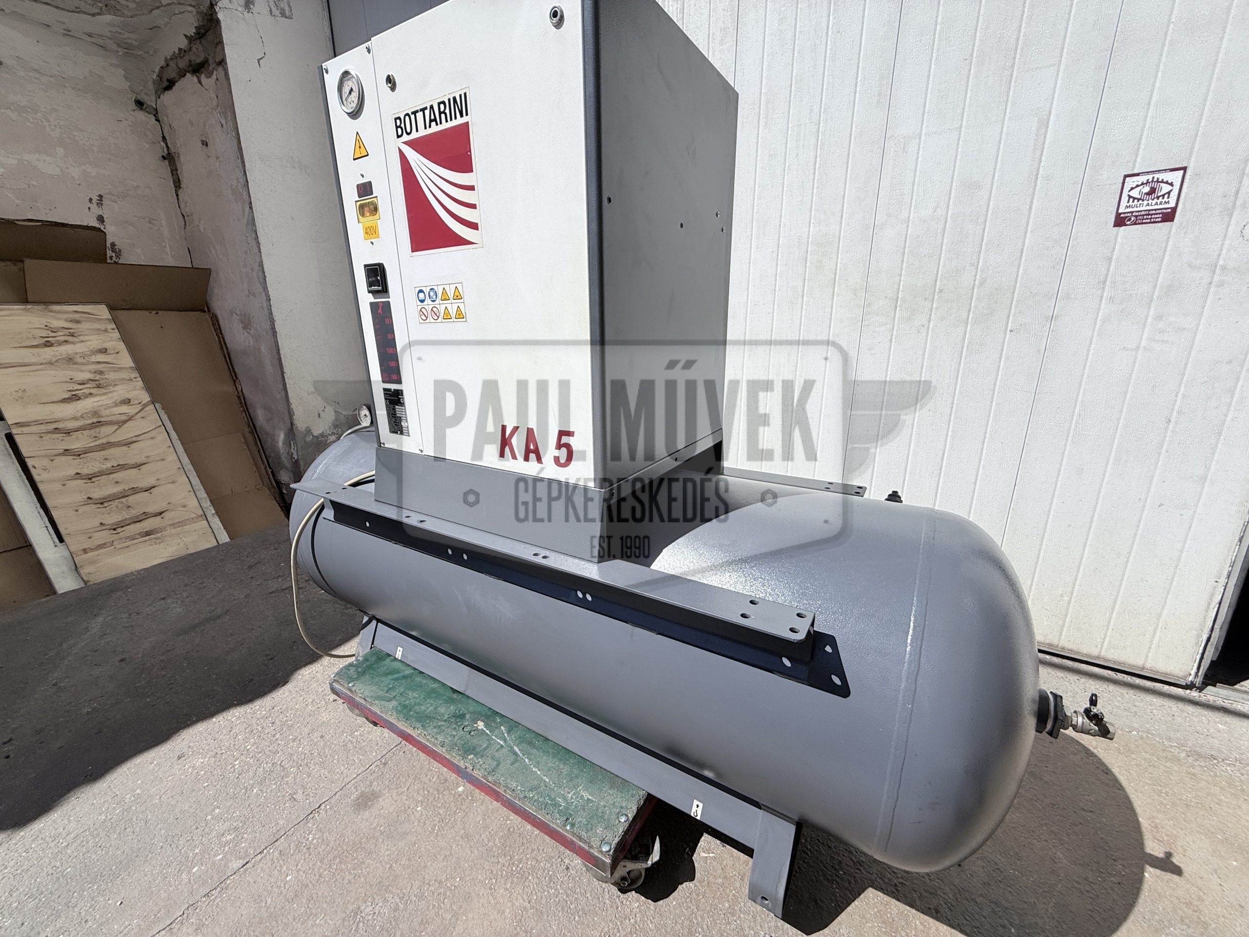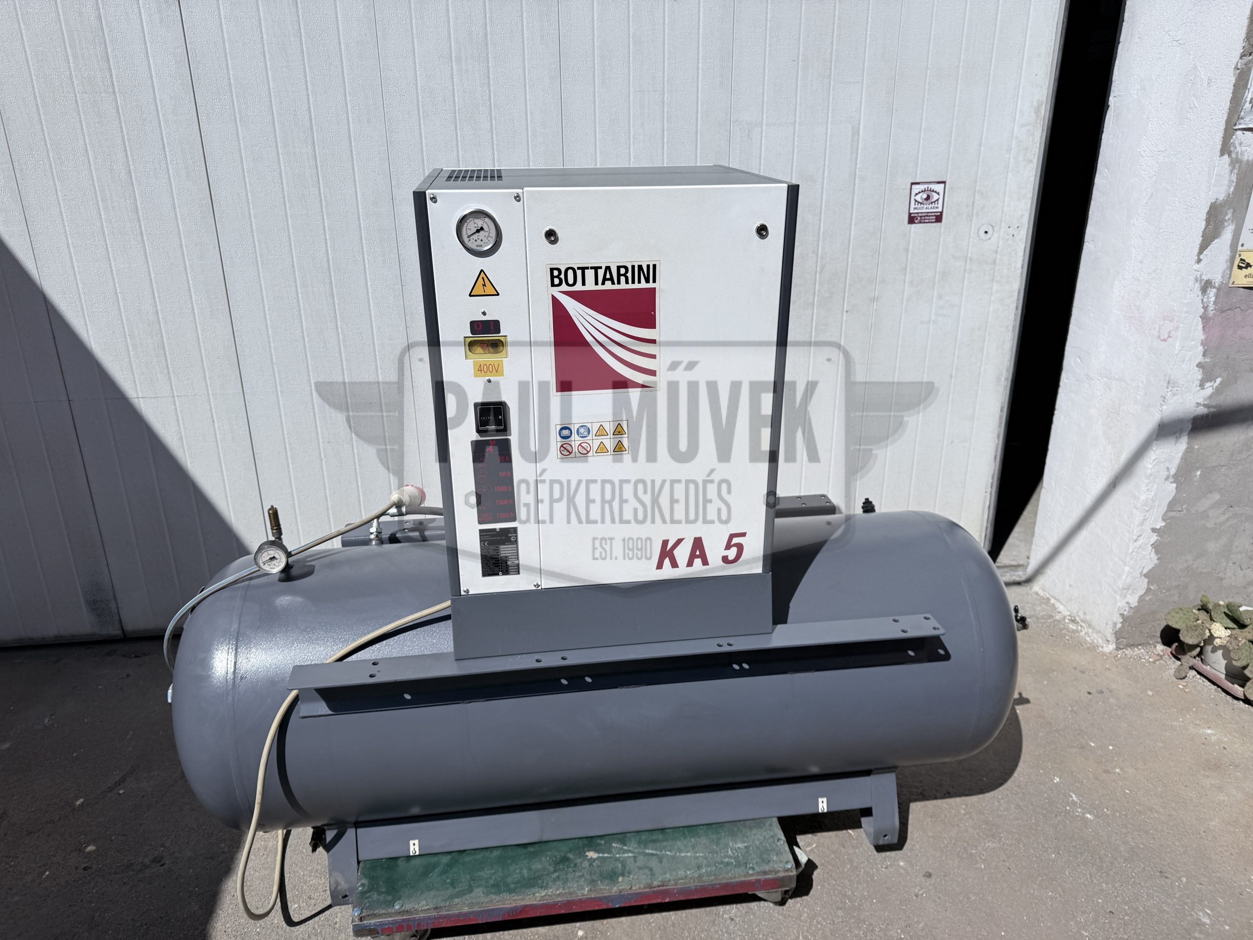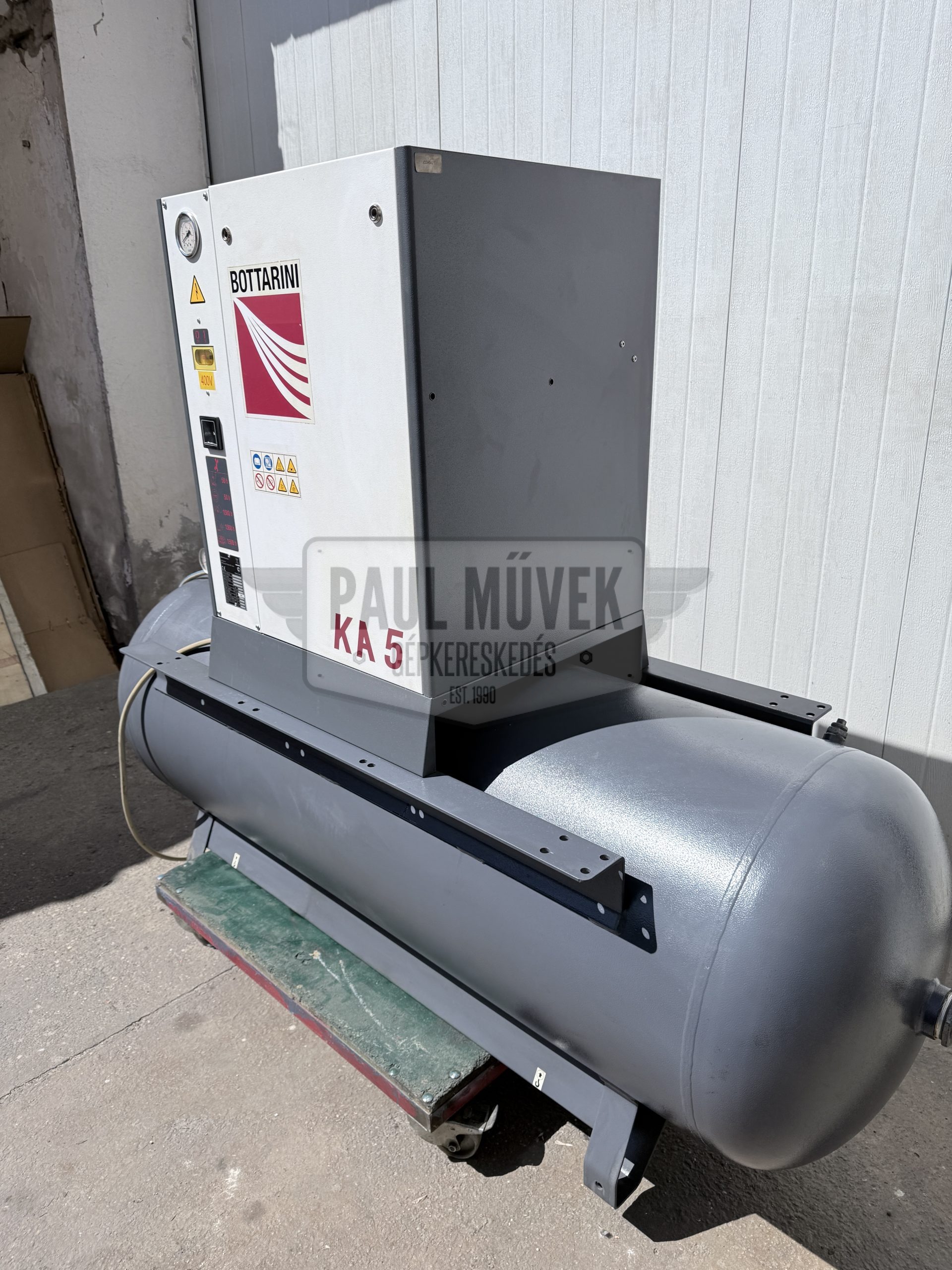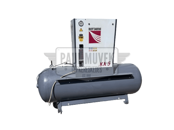 Eladó egy Gardner Denver / Bottarini frissen karbantartott, olasz gyártású, 5,5 kW-os, tartályra épített, olajbefecskendezéses, ékszíjmeghajtásos, ipari csavarkompresszor 6 hónap jótállással.